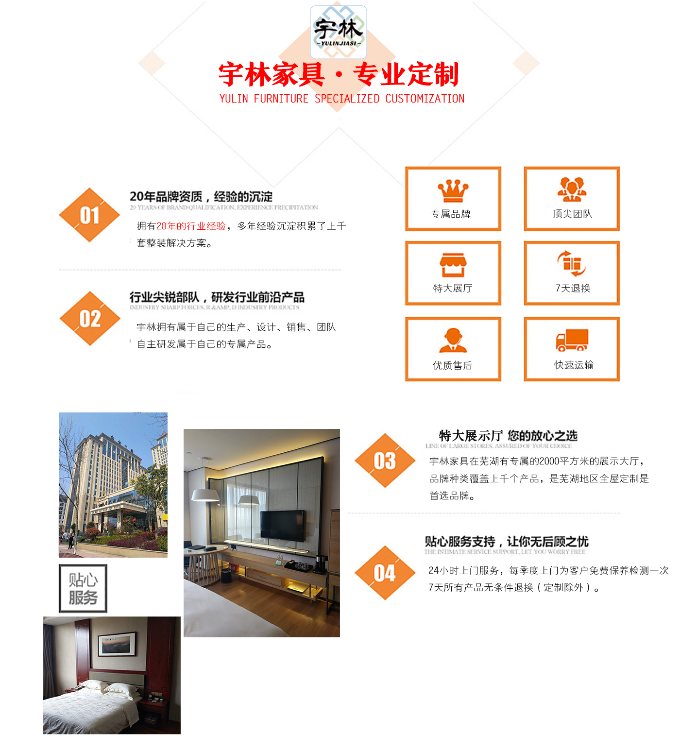 蕪湖宇林工貿(mào)有限公司創(chuàng)建于1996年,位于蕪湖高新技術(shù)開發(fā)區(qū)南區(qū),占地面積13000余平方米。是一個集研發(fā)、設(shè)計為一體的綜合性公司,公司主營整體家居定制、酒店家具定制、娛樂場所配套家具以及軟體系列,團隊,銳意革新、進去不息的理念,逐漸成為蕪湖家具行業(yè)的生產(chǎn)廠家,并在2006年注冊了“宇林”牌商標。宇林品牌家具依現(xiàn)代與古典相結(jié)合的多種實木家具、實木貼皮家具。家具做工精細,多用人工雕刻;其自然、典雅的風(fēng)格在很大程度上引導(dǎo)著人...